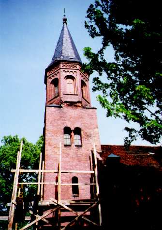 Backsteinkirche wieder aufgebaut wird. Die kleinere der beiden Glocken